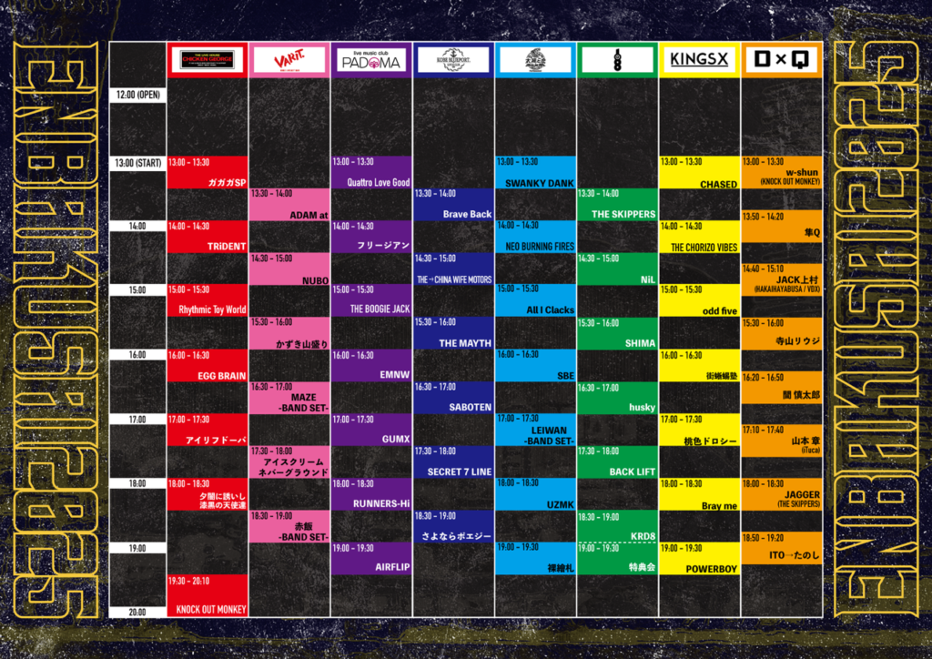 アイリフドーパ / 赤飯 / Rhythmic toy world / SWANKY DANK / THE SKIPPERS / ADAM at / AIRFLIP / All I Clacks / THE BOOGIE JACK / Bray me / THE MAYTH / MAZE / SECRET 7 LINE / 裸絵札 / フリージアン / 桃色ドロシー /SABOTEN / NEO BURNING FIRES / アイスクリームネバーグラウンド